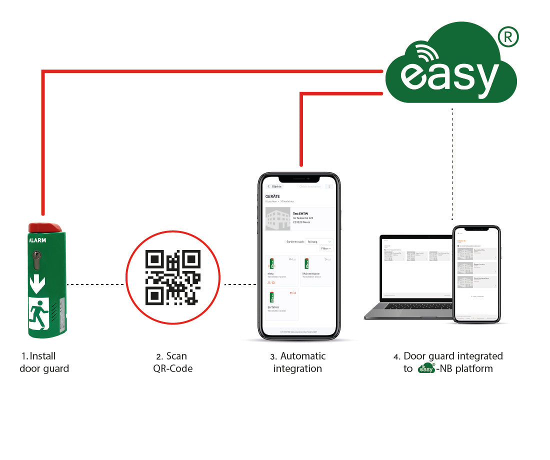 Connecting is very simple: Create a free account on the easy-NB IoT platform (www.easy-NB.de) and scan the QR code on the easy-NB door guard with your smartphone or tablet. No technical expertise or manual settings are required – the connection is established securely and automatically via the mobile network.